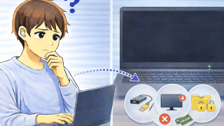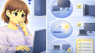 PCを起動すると画面が真っ暗なままになる原因を解説。ロゴが出ない場合や画面は点灯しているケースの切り分け方法と、入力切替・明るさ・出力先の確認手順をまとめています。
